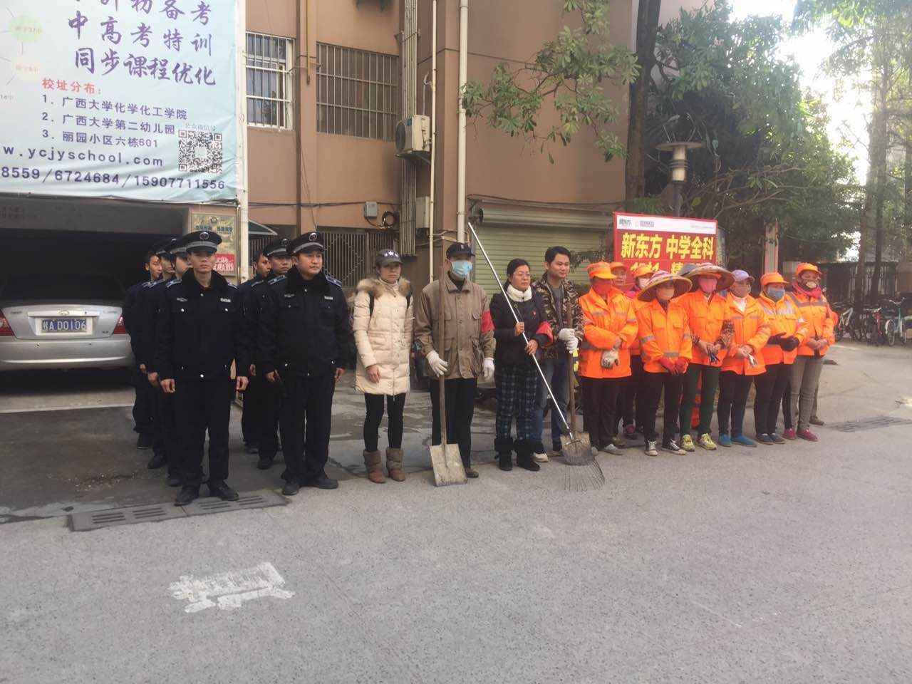 新年伊始,为了进一步改善小区环境卫生状况,创建良好的人居环境,提高社区环境质量和居民的健康水平,元月11日上午9点,城管监察大队西乡塘中队会同多部门,对丽园小区(农院路10号)开展联合执法整治工作,此次整治参与人员为住建局房管所5人、大行动办2人、西乡塘街道办5人、城管中队8人、环卫10人,整治内容为杂物乱堆放、乱粘贴小广告、跨门槛经营、车辆乱停放。
